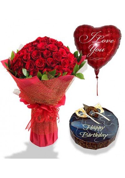 birthday flowers cake balloons30 red roses, birthday chocolate cake & balloon |