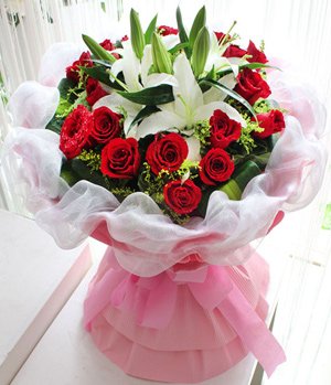 Enjoying Your LifeSelected 19 stems red roses and 2 stalks white perfume lilies, small floral decorated. White gauze, pink crepe paper round style hand bouquet, bowknot tied the end. |