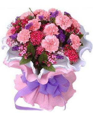 Pink Carnations20 pink carnations with forget met not and green leaves, white and pink paper beautiful packing. |