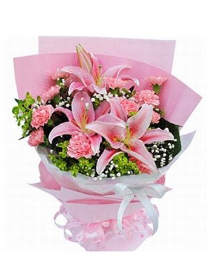 Pink Flower Love3 pink lilies, 12 pink carntions with baby's breath ornament, pink crepe paper packing. |