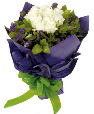 Purple Memory11 white roses match forget-me-not and green. wrapped by purple round paper with green bowknot. The intoxicating combination of our white roses with greenery gives you an extraordinary way to make a heartfelt statement to your favorite person. |