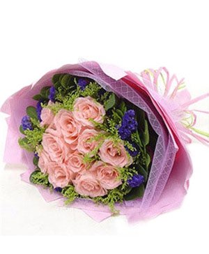 Sweet Moment11 pink roses match solidago canadensis and dont-forget-me. Double layer pink crepe paper packing, pink ribbon the bottom. |