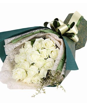 The Pure Love21 white roes with white smallflowers. White-green-blue crepe paper wrapping, fan-shaped bouquet. |